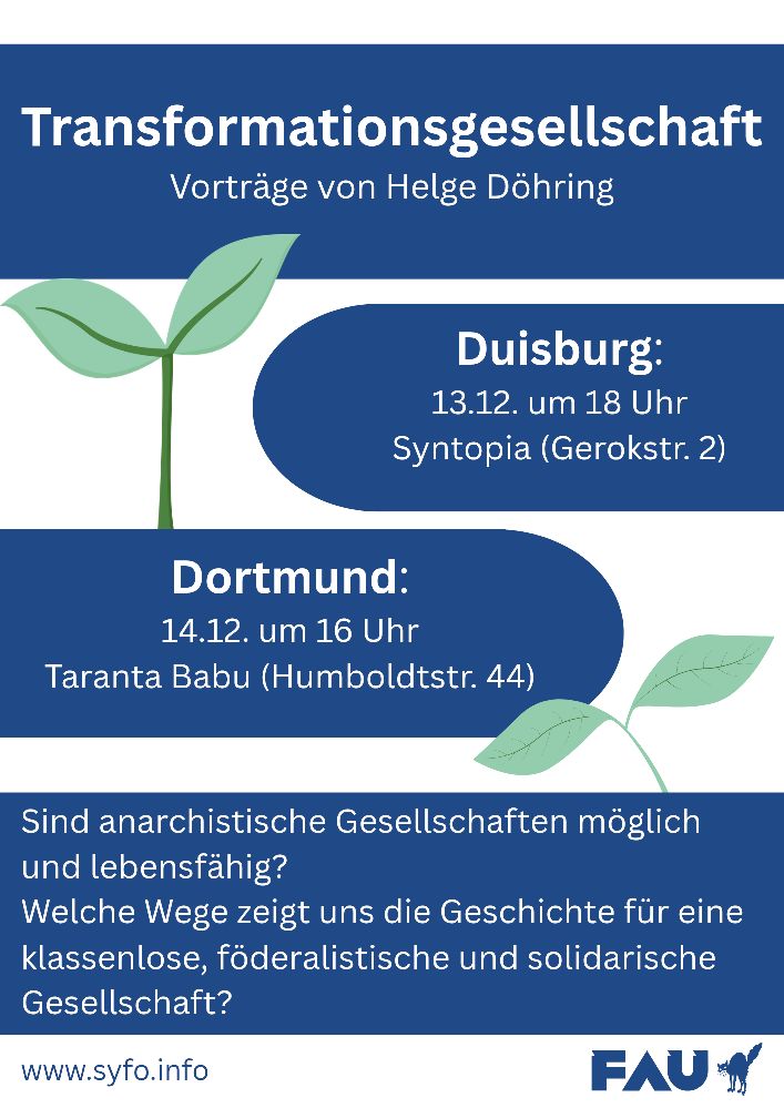 Sind anarchistische Gesellschaften möglich und lebensfähig? Welche Wege zeigt uns die Geschichte für eine klassenlose, föderalistische und solidarische Gesellschaft? Über die Rolle der anarcho-syndikalistischen Gewerkschaften, der politischen Verwaltung und der kulturellen Vorbedingungen spricht der Historiker Helge Döhring vom Institut für Syndikalismusforschung (SyFo), www.syfo.info mit uns.